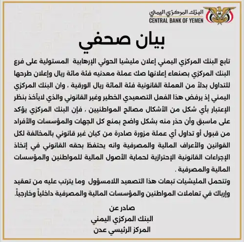 بيان صحفي من البنك المركزي عدن متعلق باصدار عملة م