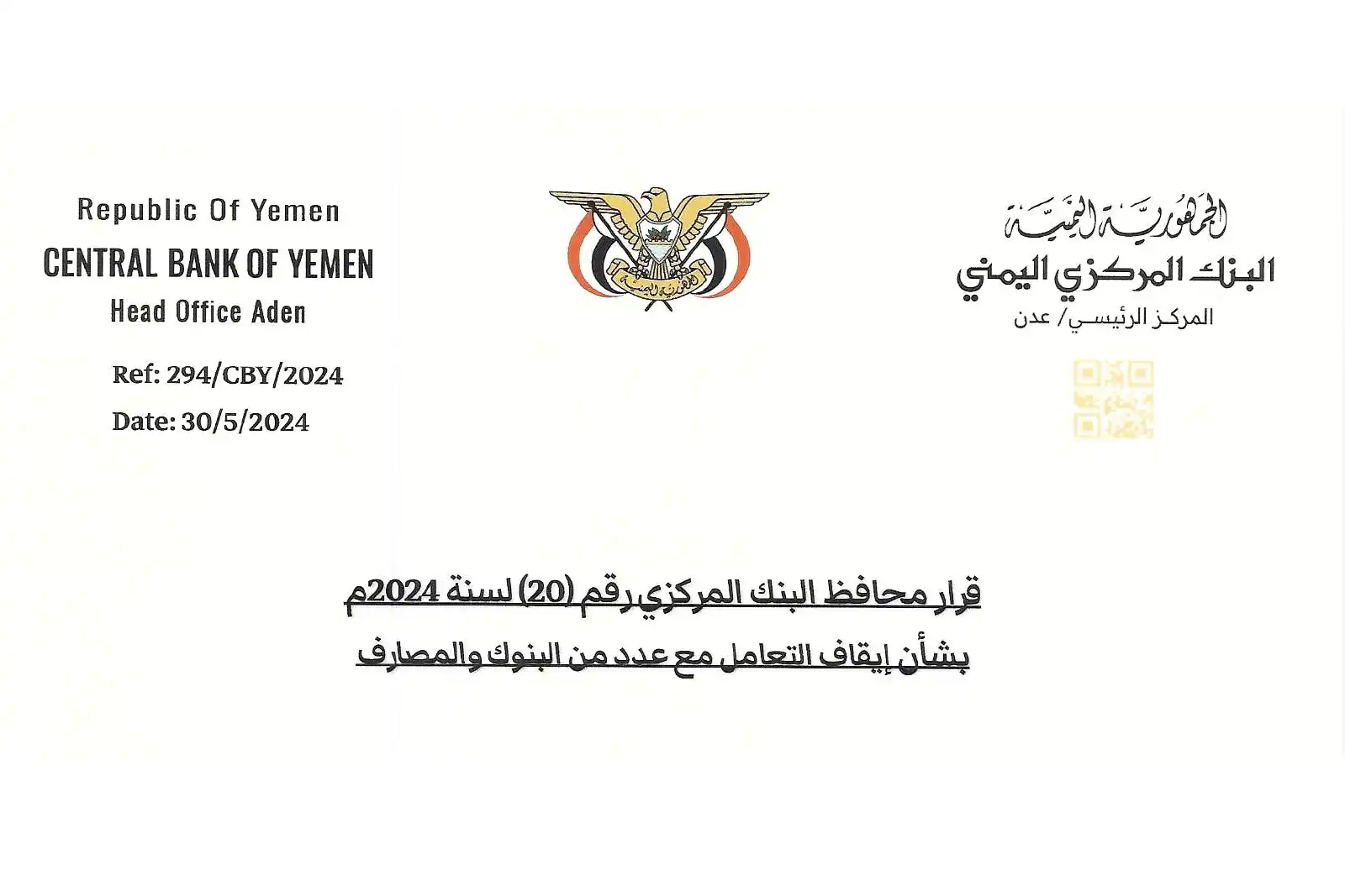 قرار محافظ البنك المركزي بشأن إيقاف التعامل مع عدد من البنوك والمصارف (وثيقة) 2024-05-30